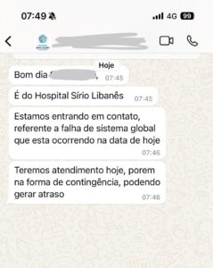 A brasileira trabalha no call center de uma empresa do setor de turismo. Segundo ela, os atendentes ficaram do lado de fora da sala de trabalho, enquanto lideranças e especialistas e tecnologia da informação atuavam para recuperar o sistema.